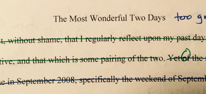 I’m reflecting on that week because of my own writing journey in a creative nonfiction piece about two of the most memorable days of life from 2008, two days that, to an outsider, would appear mostly nondescript. I’ve started exploring why these two days have impressed themselves so firmly in my memory.